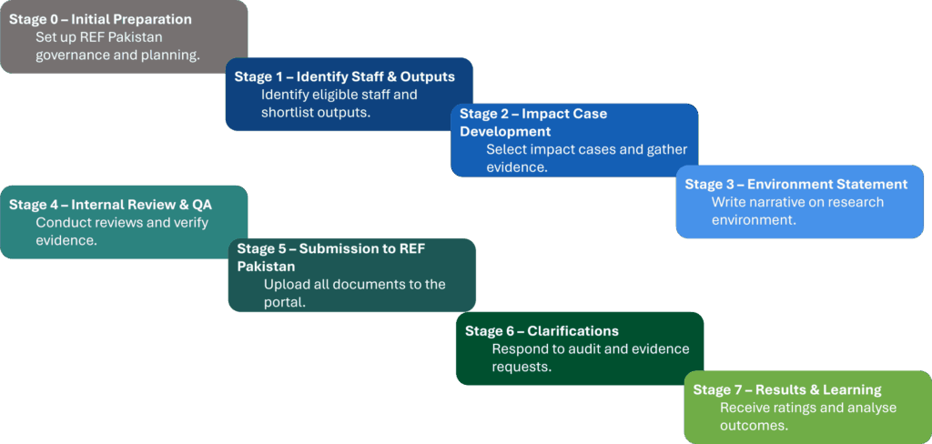 Universities must carefully select and justify the evidence underpinning each element of their REF Pakistan submission, drawing on both quantitative and qualitative sources. We are suggesting a staged approach.